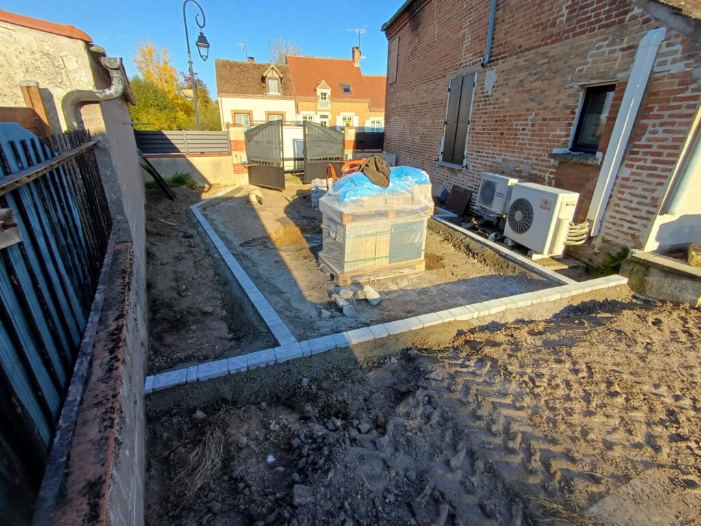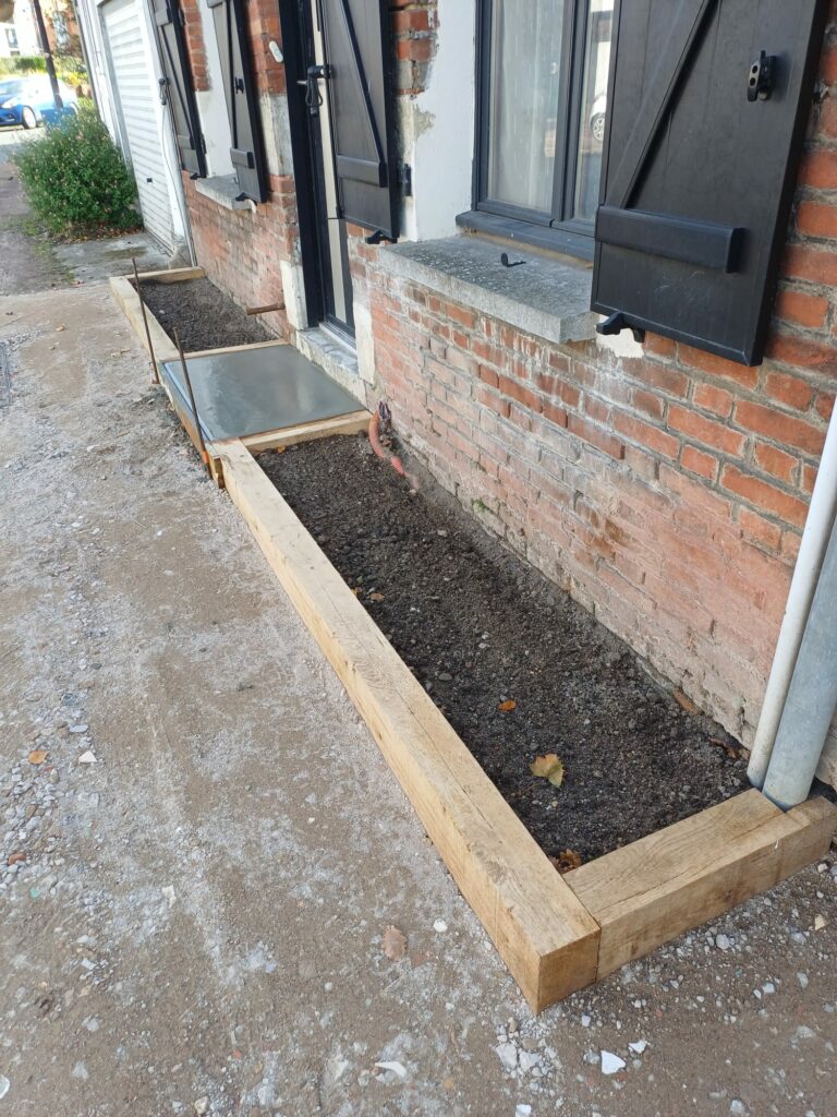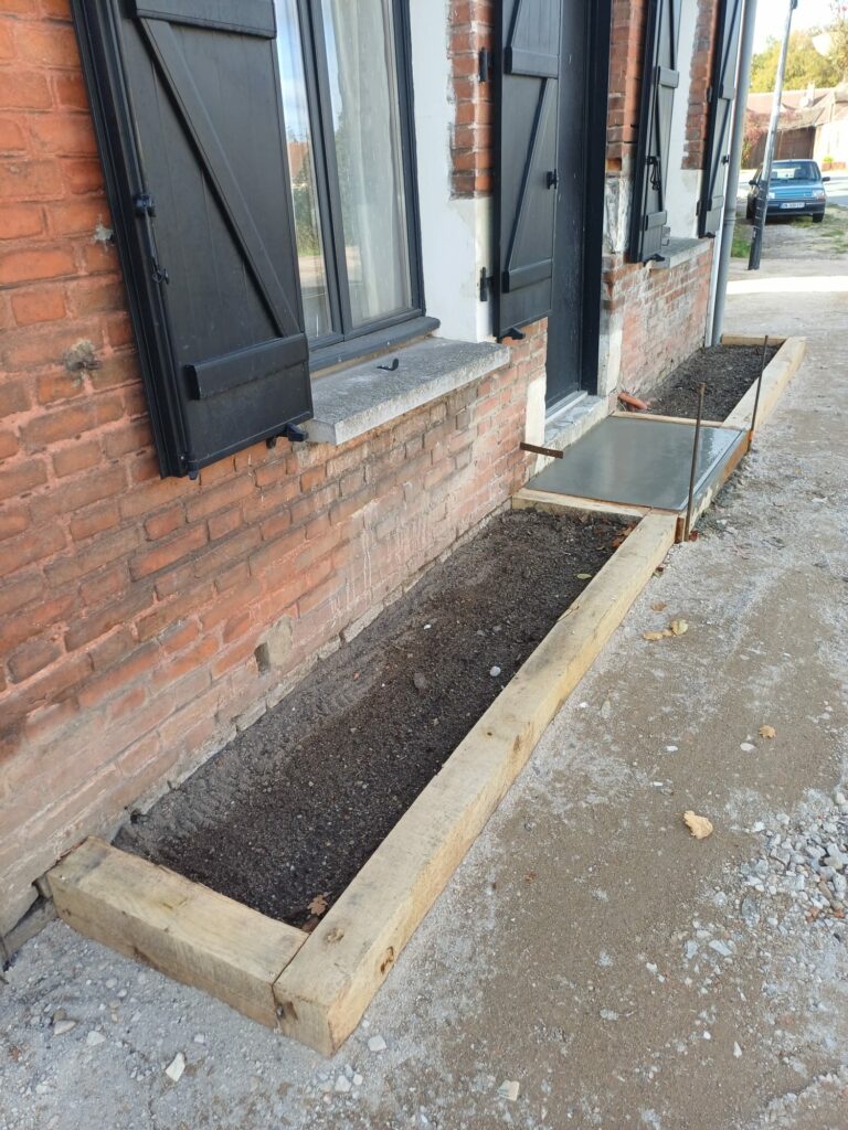 Deux jolies jardinières en traverses de chêne sont en place. Le béton pour la marche de la porte d’entrée a été coulé. Le fond de forme de l’allée est préparé.