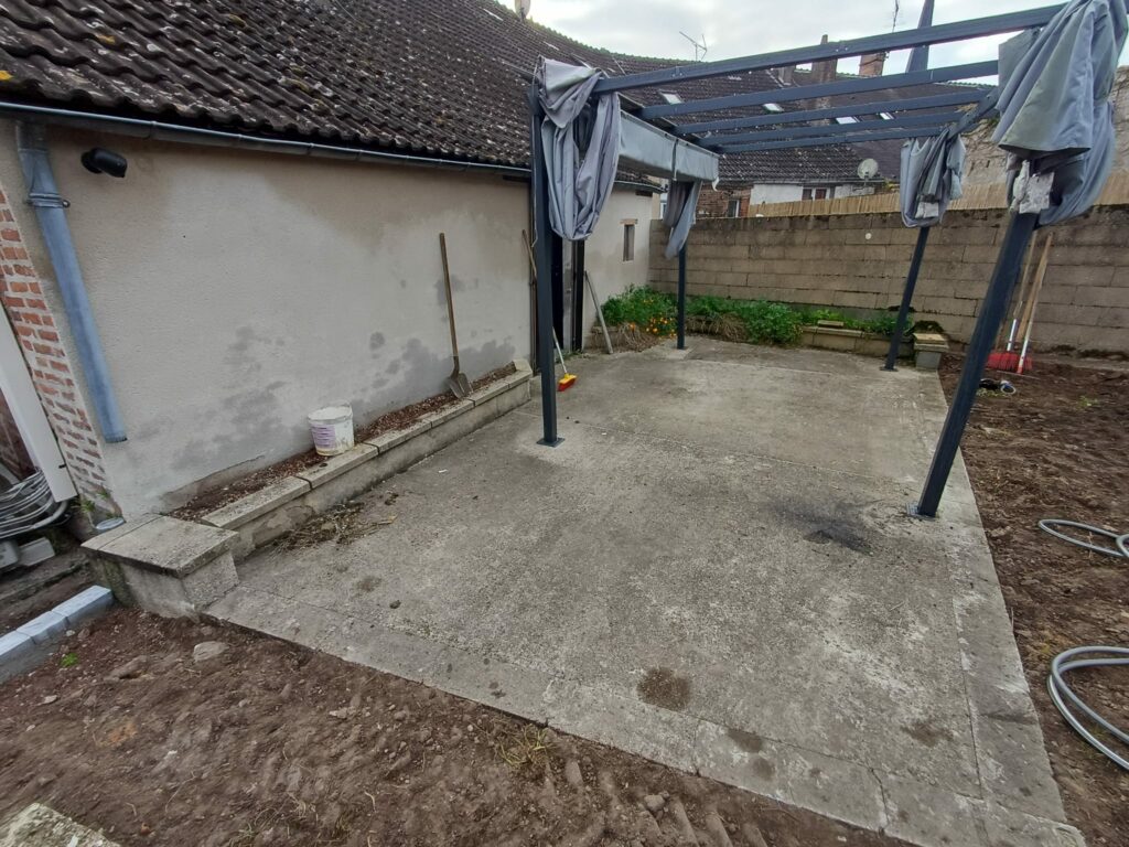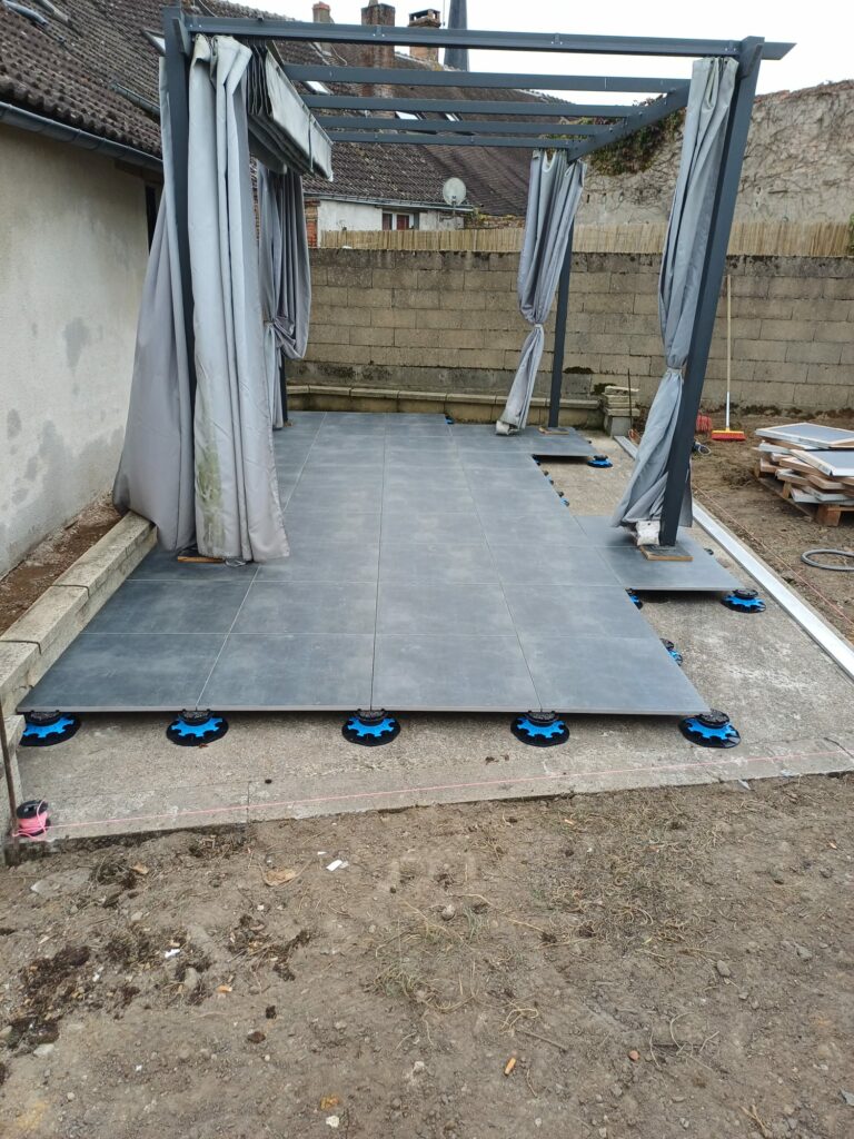 Place à la pose de la terrasse en dalles céramiques 60×60 sur plots. Ce format moderne et élégant offre à la fois stabilité, esthétique et facilité d’entretien. Cette terrasse deviendra un vrai coin détente, reliant harmonieusement la maison au jardin.