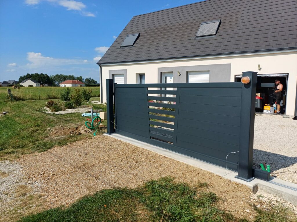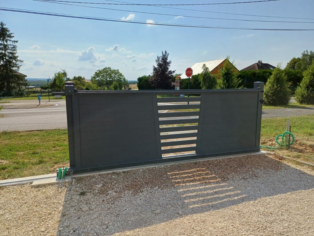 Selon les besoins du client, le portail peut être manuel ou motorisé, avec plusieurs finitions possibles (aluminium, acier thermolaqué, etc.).
